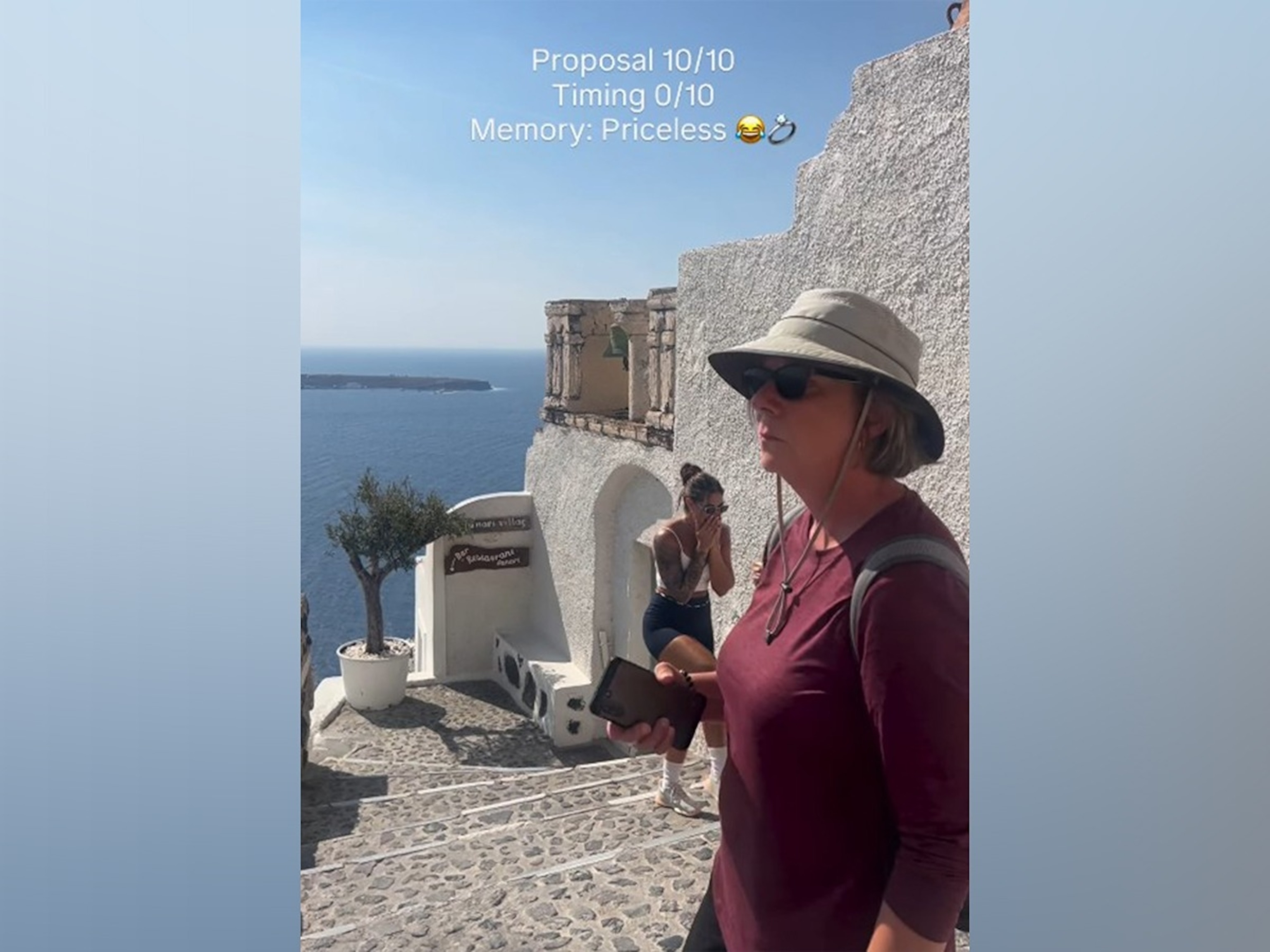 "Our dream Santorini proposal accidentally turned into a candy bar ad," Melani wrote in the video's caption.