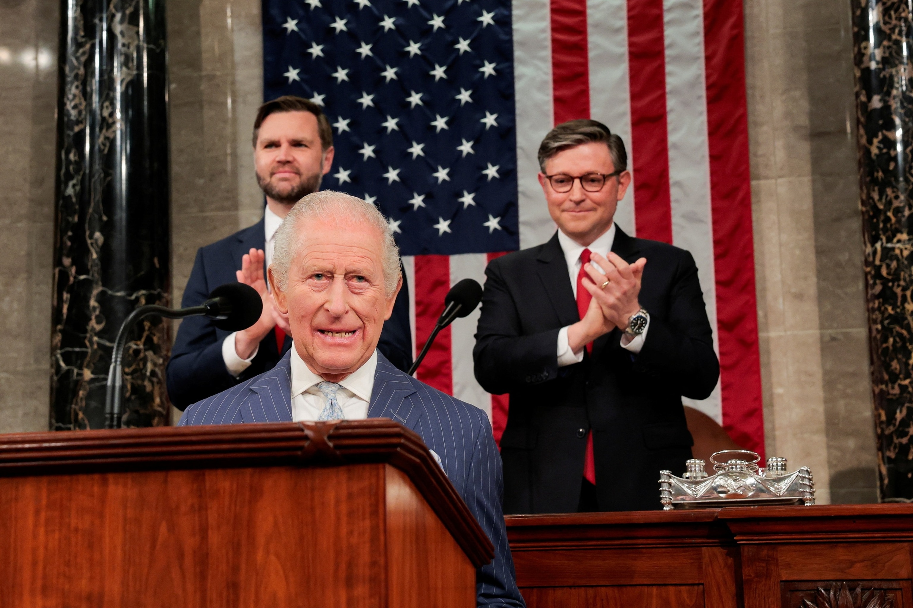 Vice President JD Vance and Speaker of the House Mike Johnson applaud the arrival of Britain's King Charles III to speak to a Joint Meeting of Congress in the House Chamber at the US Capitol in Washington, April 28, 2026.