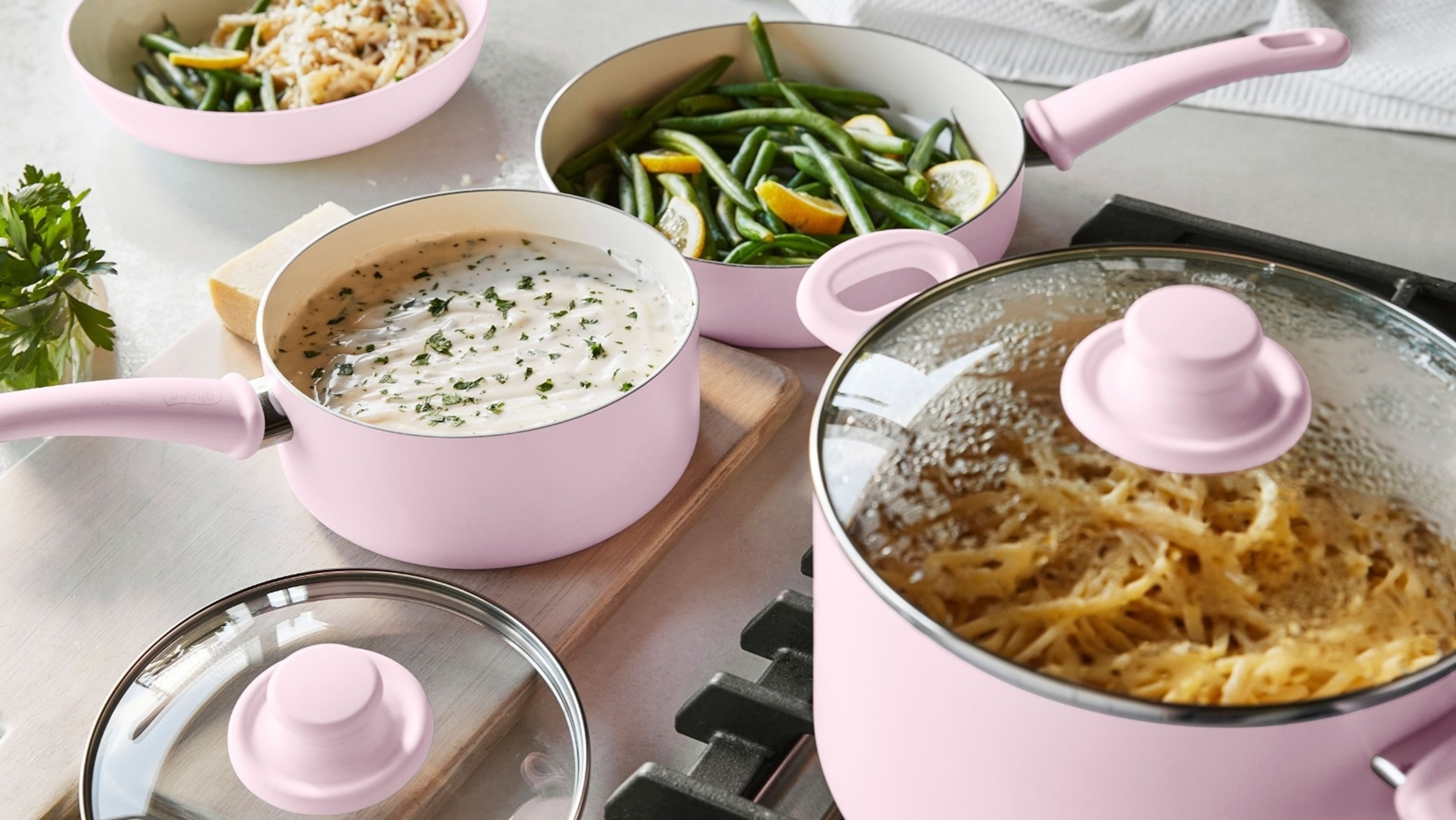 Cook with confidence thanks to GreenLife's signature PFAS-free ceramic nonstick coating. Enjoy easy-release, mess-free cooking without compromising on health. With ultra-tough construction and quick-heating design, these heavy-duty bodies deliver fast heating, daily durability and easy cleanup with a dishwasher-safe design. Bakelite handles stay comfortable and cool on the stovetop for better control with every stir and saute, while the wobble-free construction provides extra strength and helps distribute heat evenly for consistent cooking. The Soft Grip 8-Piece Cookware Set includes a 10-inch frypan, a 2-quart saucepan with lid, a 5-quart stockpot with lid, a 2.5-quart saute pan with lid and a nylon turner. The Breakfast Sets include an 8-inch frypan and silicone spatula. Choose from fun colors. Limit five per order. Shipping is $4.99.