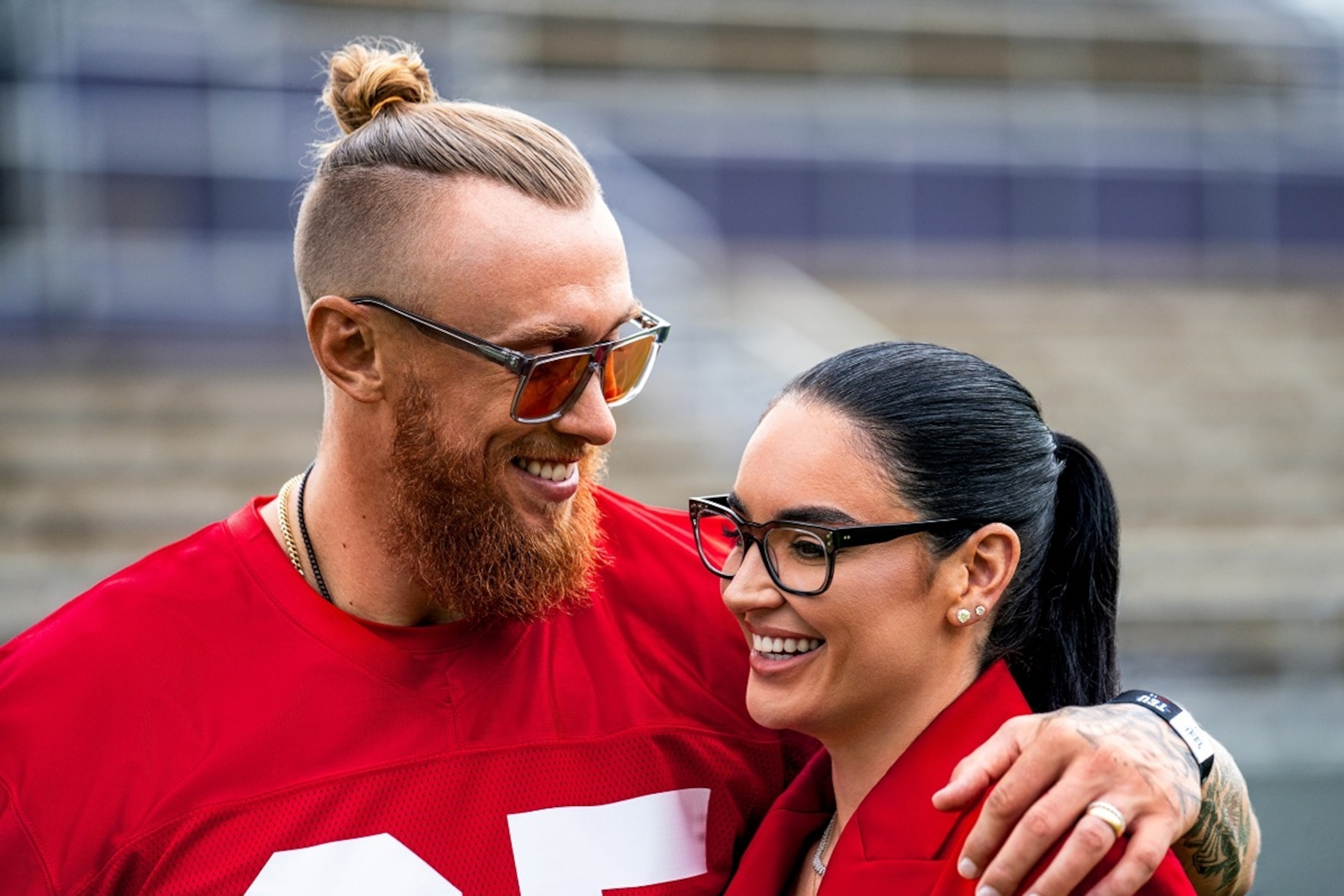 George Kittle might be best known as the tight end for the San Francisco 49ers, but he, alongside his fashion plate wife Claire, is also an emerging style icon to those in the know who keep up with the NFL player's bold, colorful off-field looks.