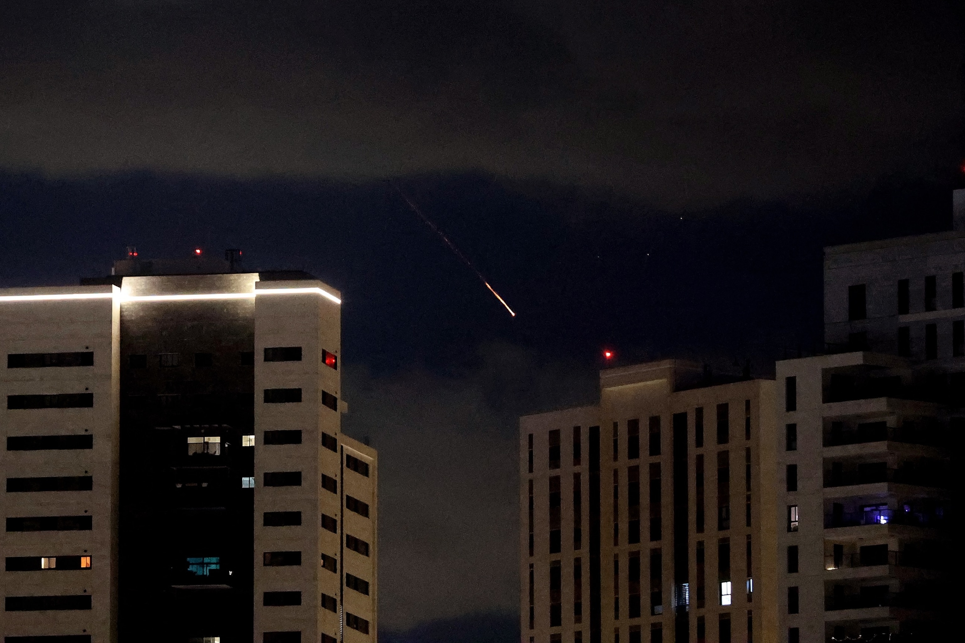 Rocket trails are seen in the sky above the Israeli center coastal city of Netanya amid a fresh barrage of Iranian missile attacks on March 9, 2026.