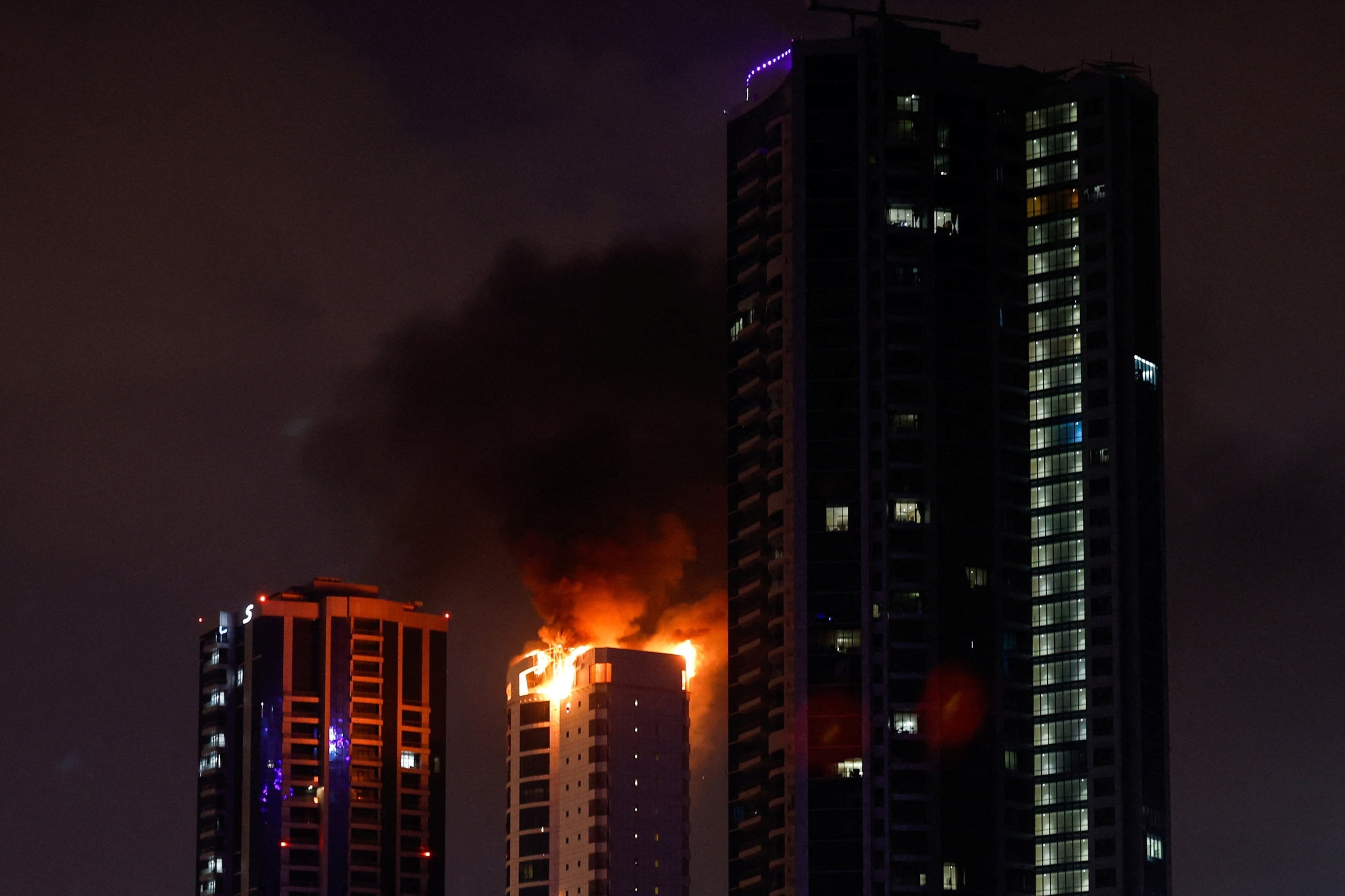 Smoke rises from a burning building hit by an Iranian drone in Manama, Bahrain, on Feb. 28, 2026.