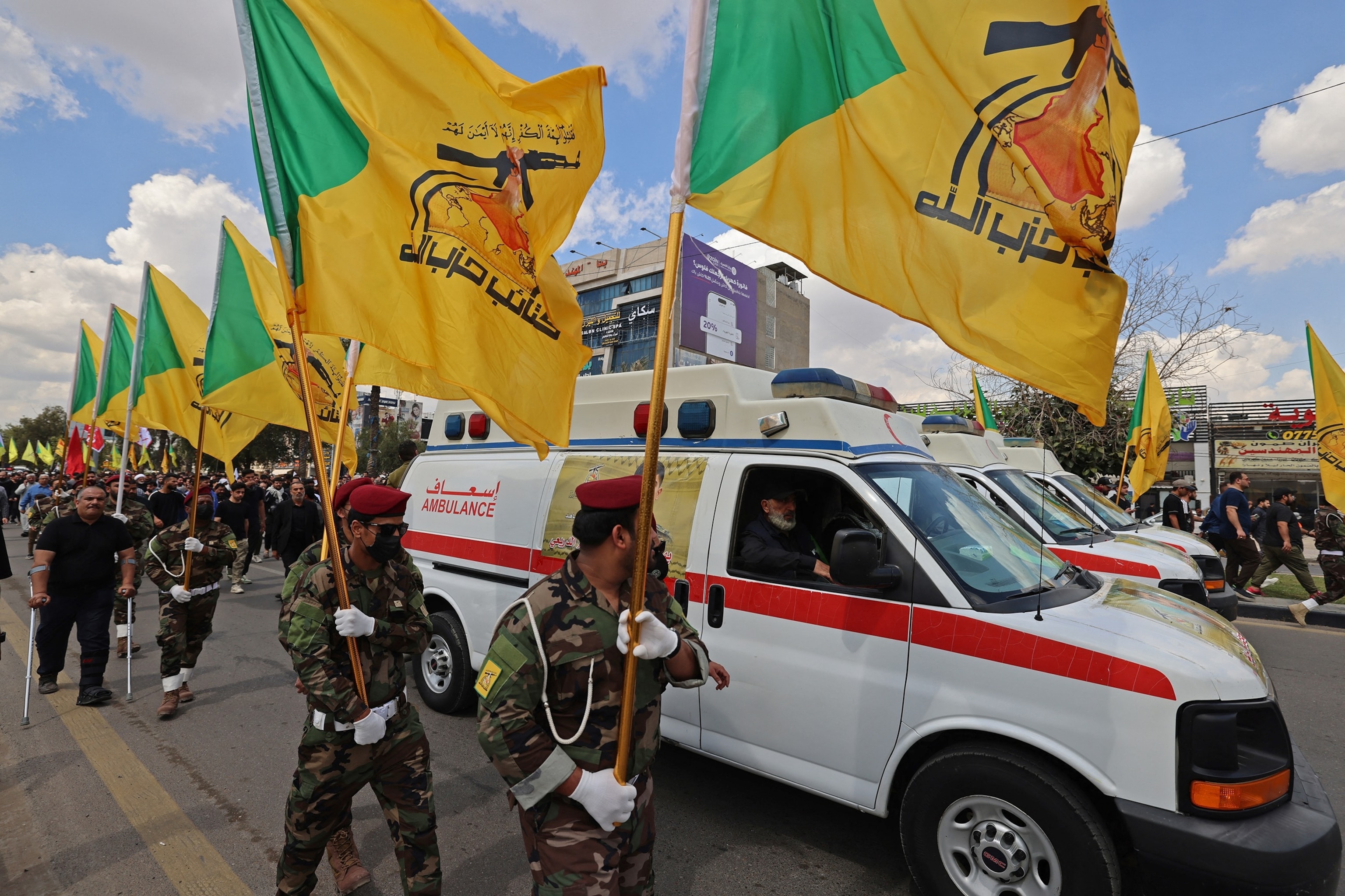 Members of Iraq's pro-Iran paramilitary group Hezbollah Brigades gather in a mourning procession for a fighter in Baghdad on April 8, 2026.