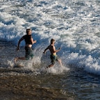 People cool off at the shore o the Bosphorus as a forest fire smoke rises in the background, during a hot summer day in Istanbul, Turkey, July 26, 2023.