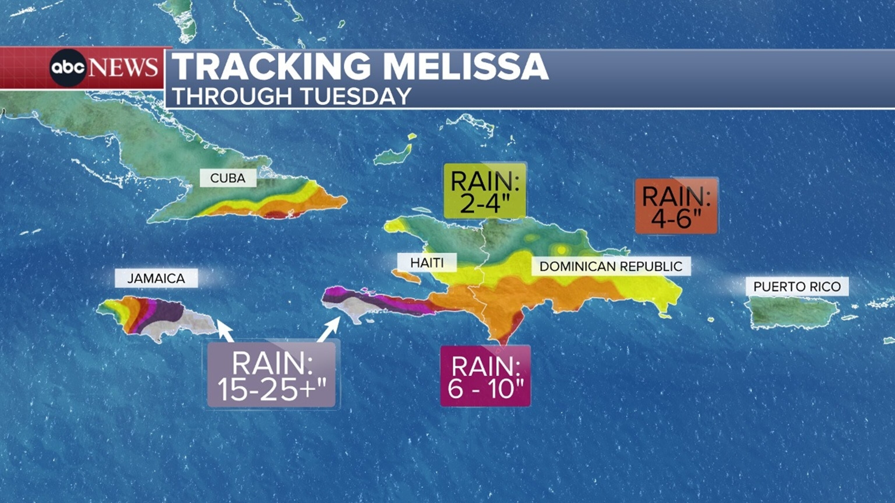Between 15 to 25 inches of rain are expected across portions of southwestern Haiti and eastern Jamaica through Monday, with locally higher amounts possible up to 35 inches.