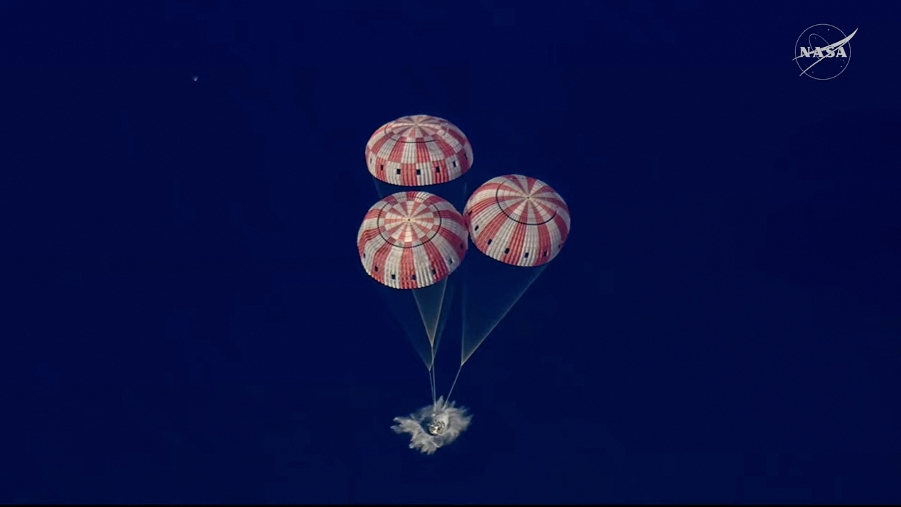 The three main parachutes have also successfully deployed, as Orion approaches splashdown.
