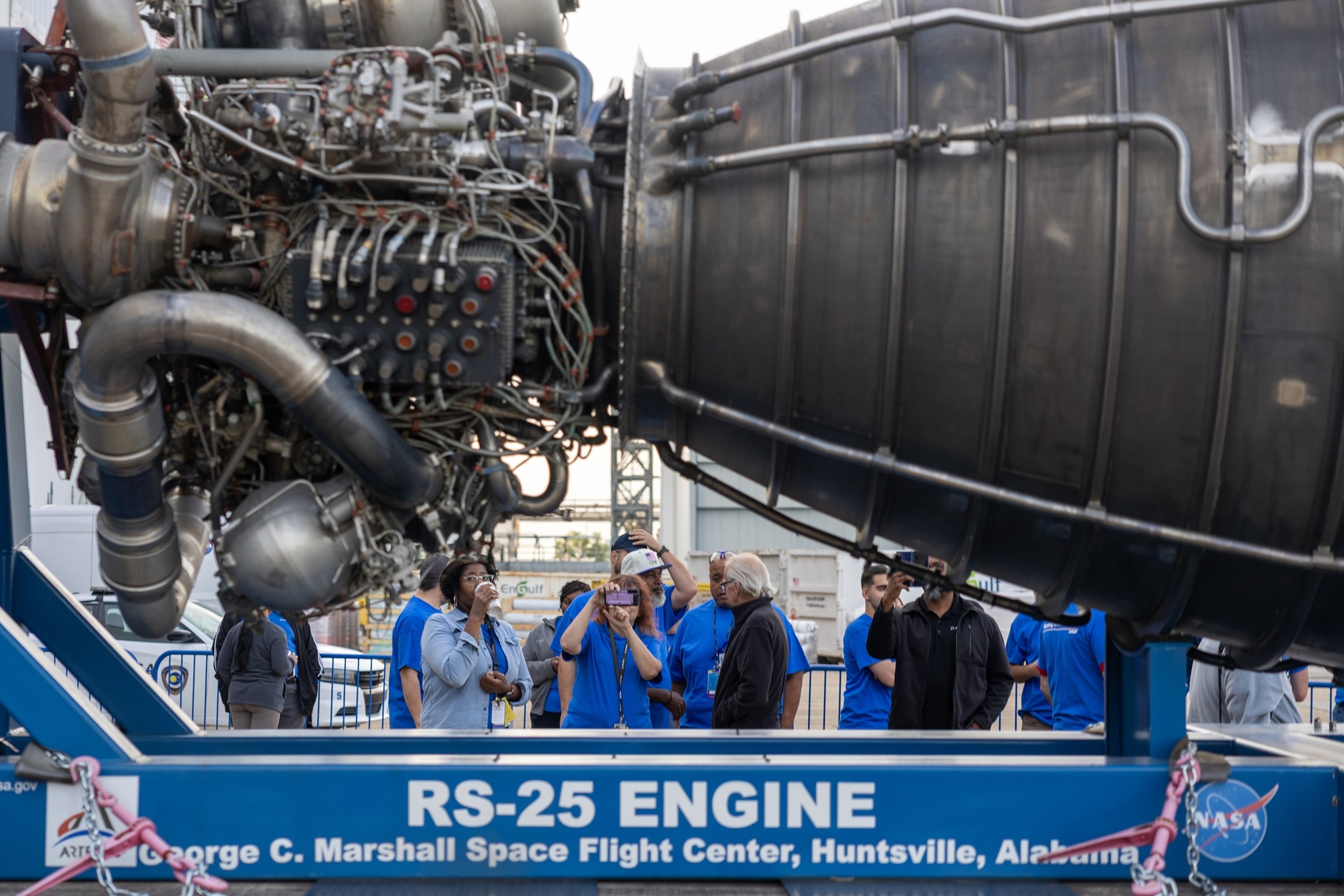 The 212-foot-long Space Launch System (SLS) core stage was manufactured at NASA’s Michoud Assembly Facility in New Orleans before traveling 900 miles aboard a barge to the space center, where the complete assembly will take place.