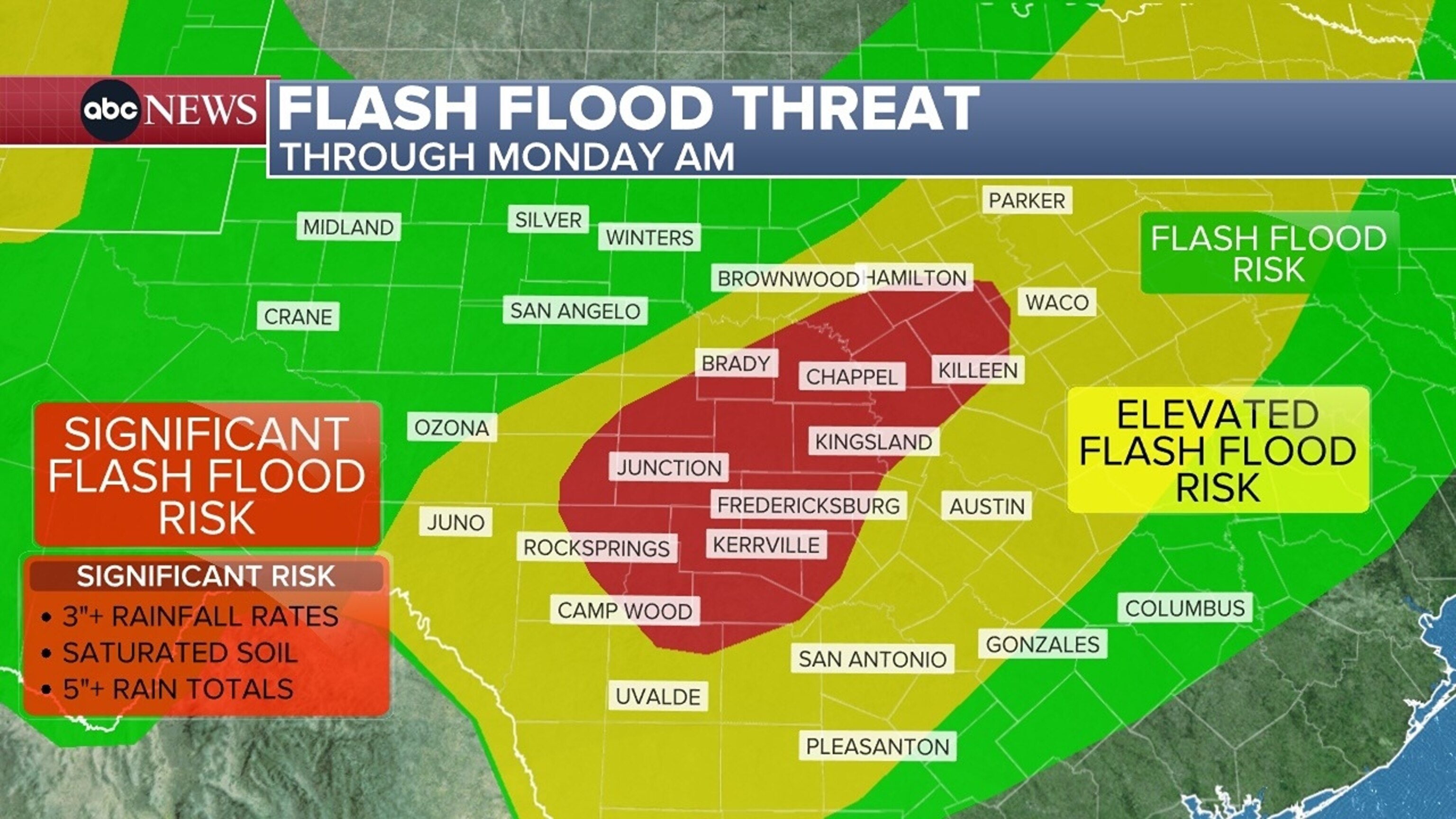 Places recently hit hard -- like Kerrville, Texas, and Burnet, Texas -- are inside this heightened potential for flash flooding, with any heavy rain and flash flooding that occurs over or adjacent to these areas likely to flow downstream via rivers that run through or nearby these devastated areas.
