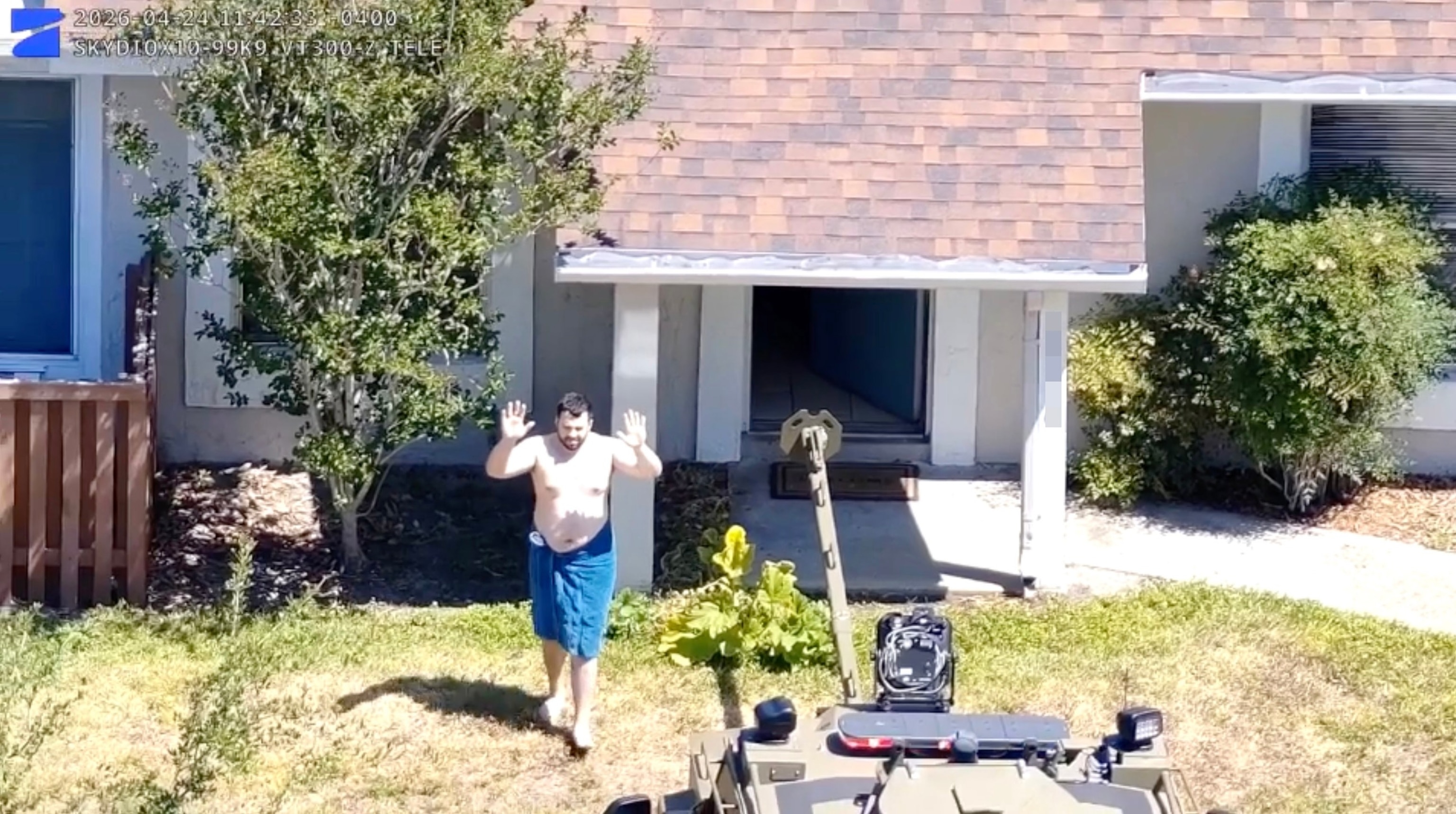 Following a brief standoff, the suspect surrendered, Maurer said. He was seen exiting the home with nothing but a towel wrapped around his waist.