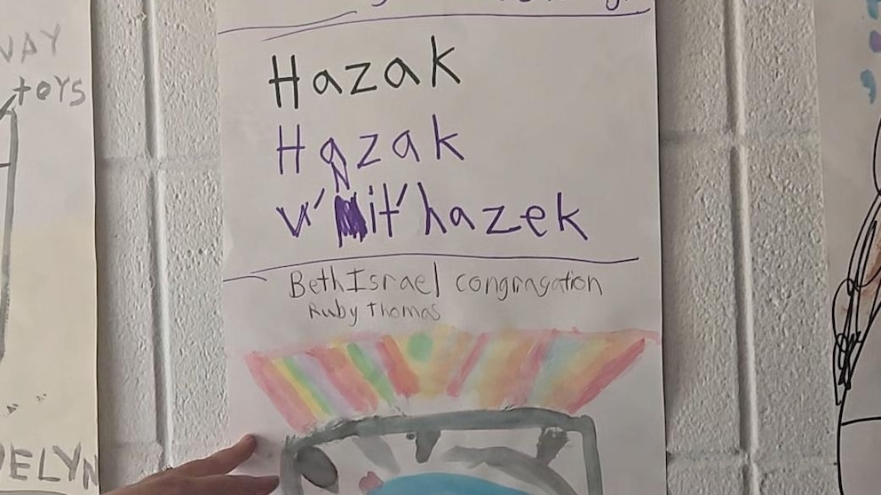 Thomas was excited to see that one of the pictures was made by her daughter, Ruby. Underneath the words to a Hebrew song that Myers taught the children about strength, Ruby drew bright blue water overcoming red flames, producing a triumphant rainbow.