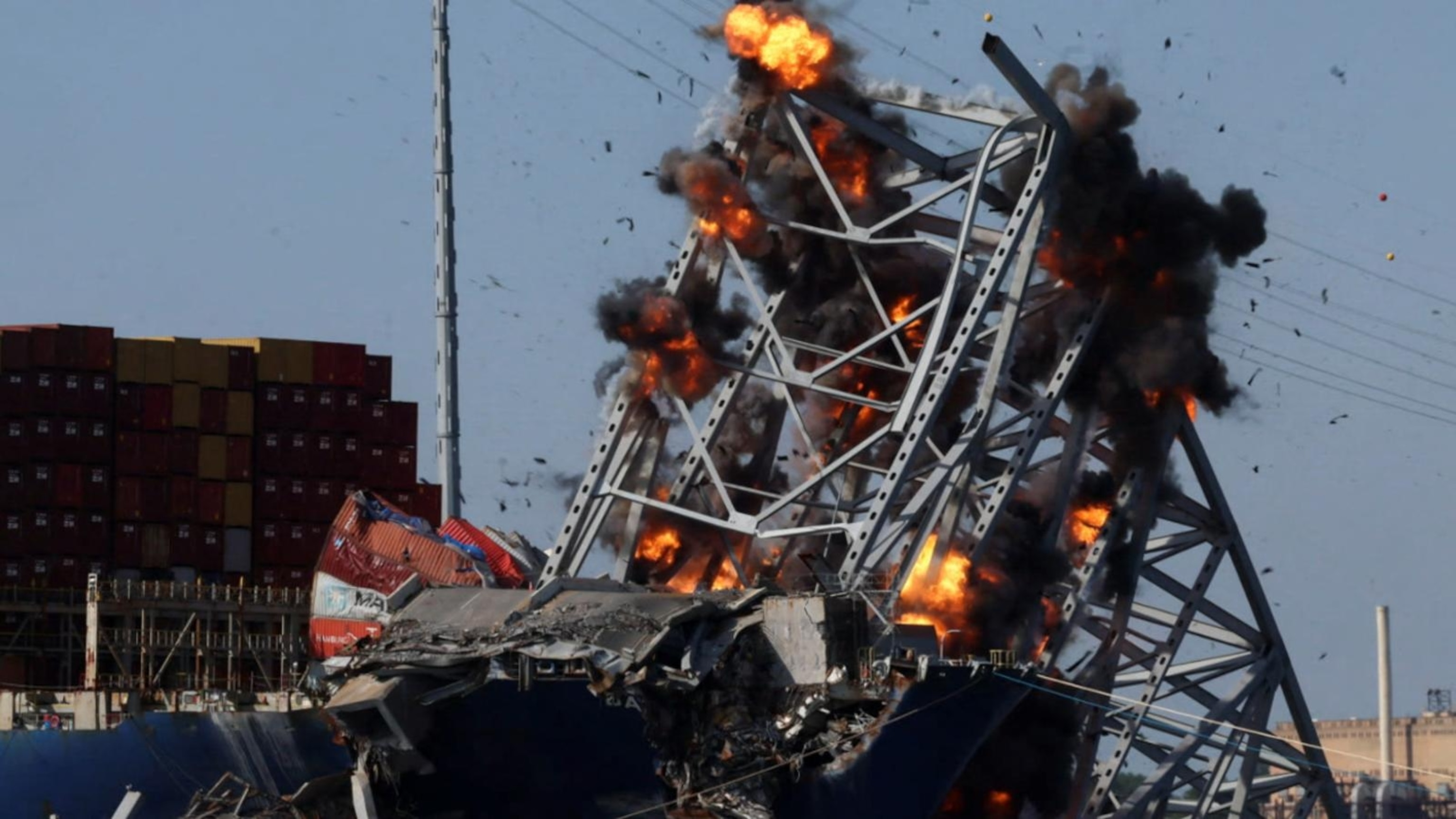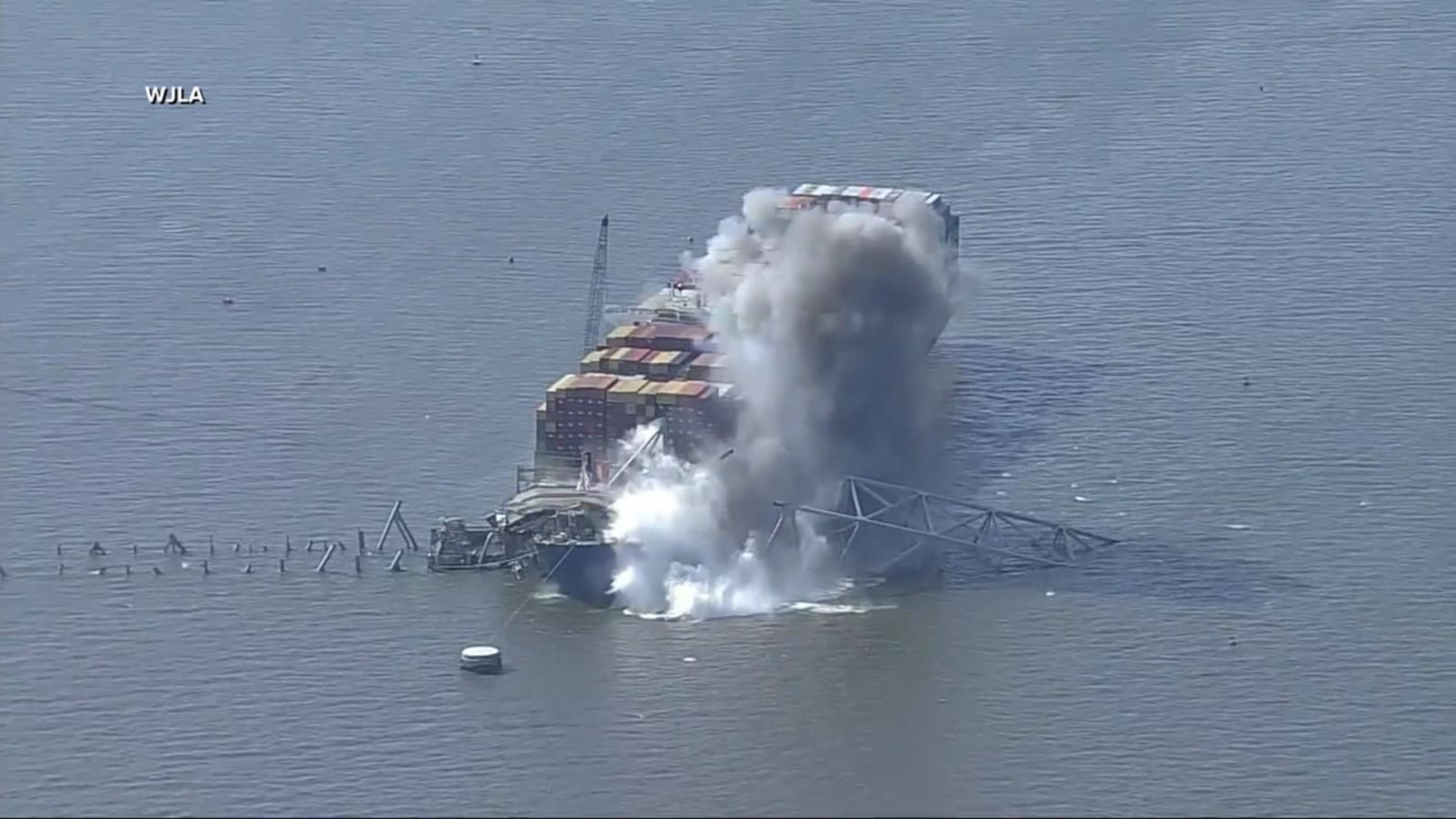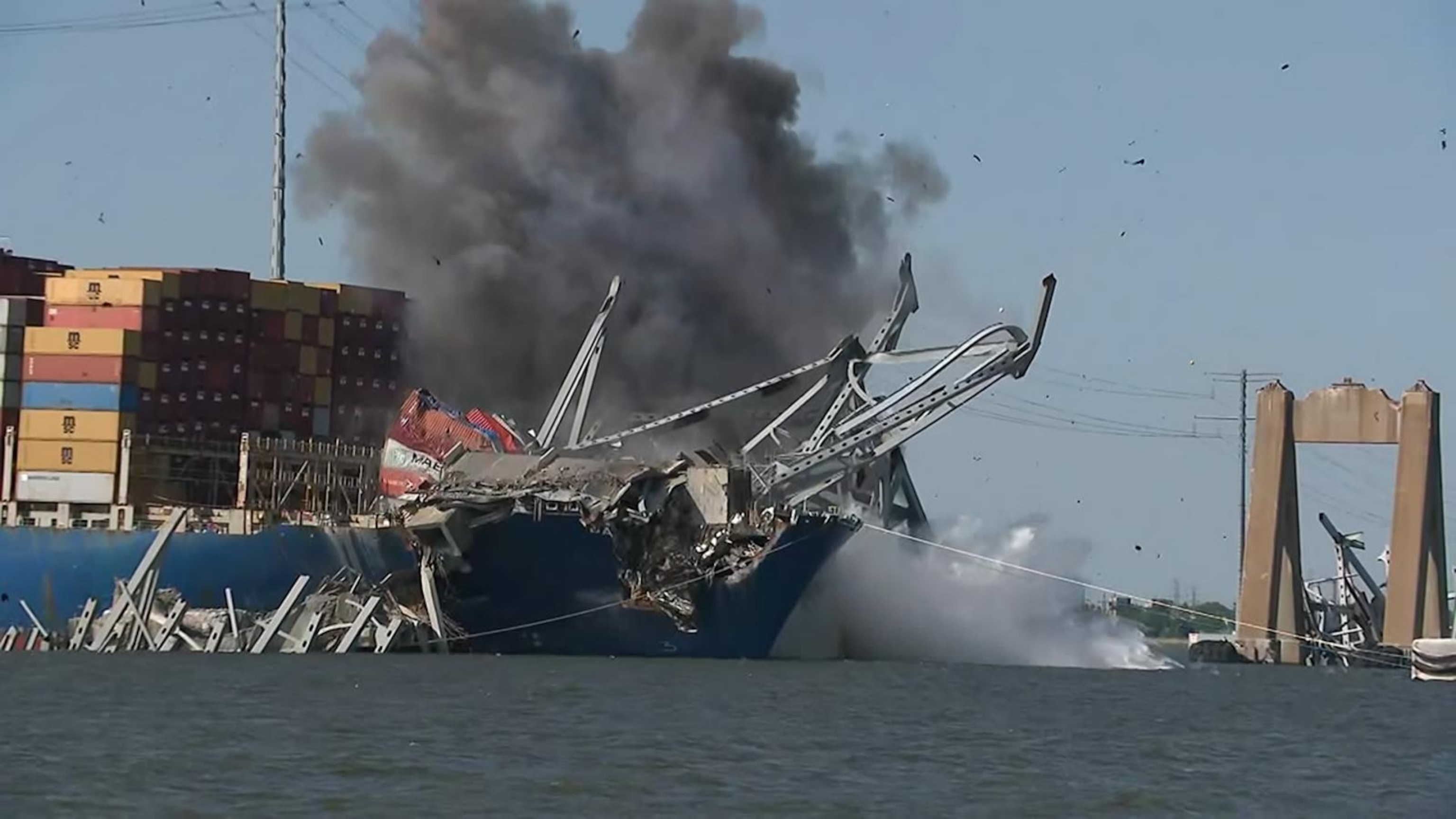 Collapsed Key Bridge breaks apart by controlled explosives