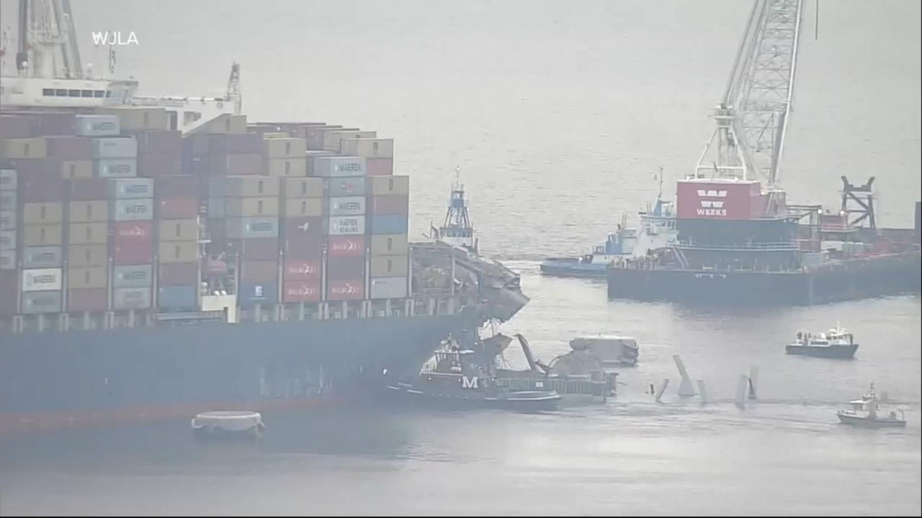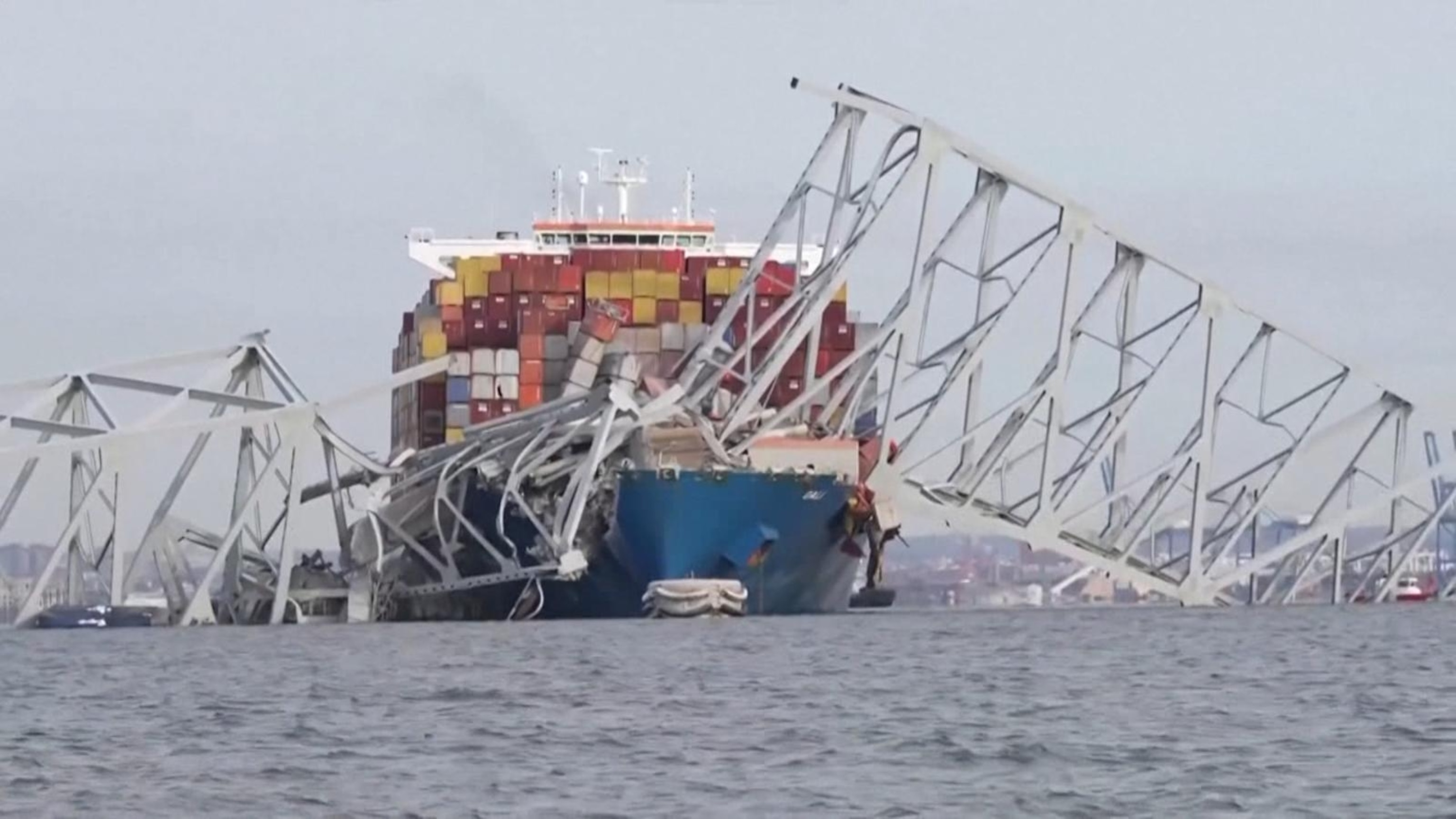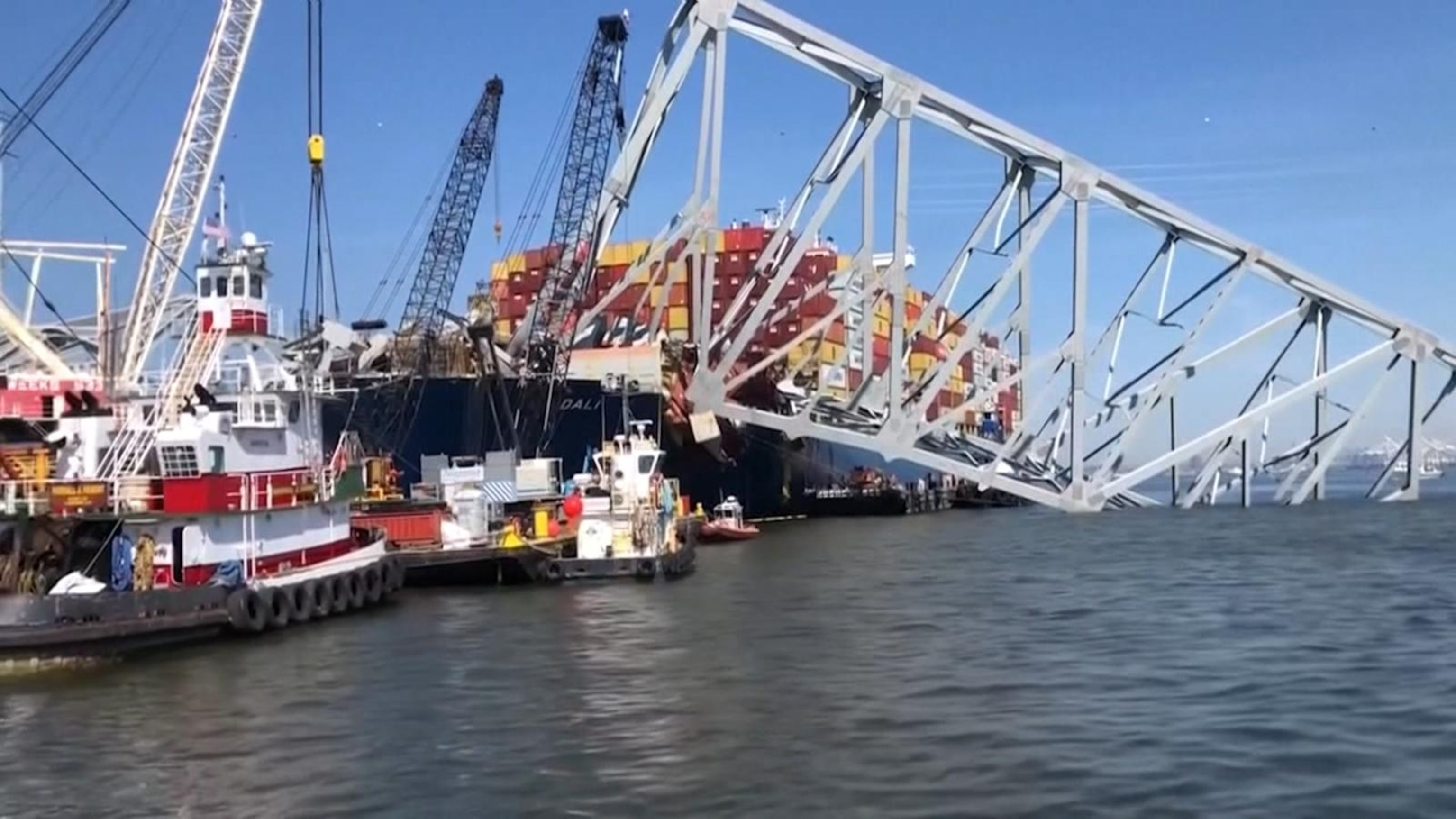 Collapsed Key Bridge breaks apart by controlled explosives