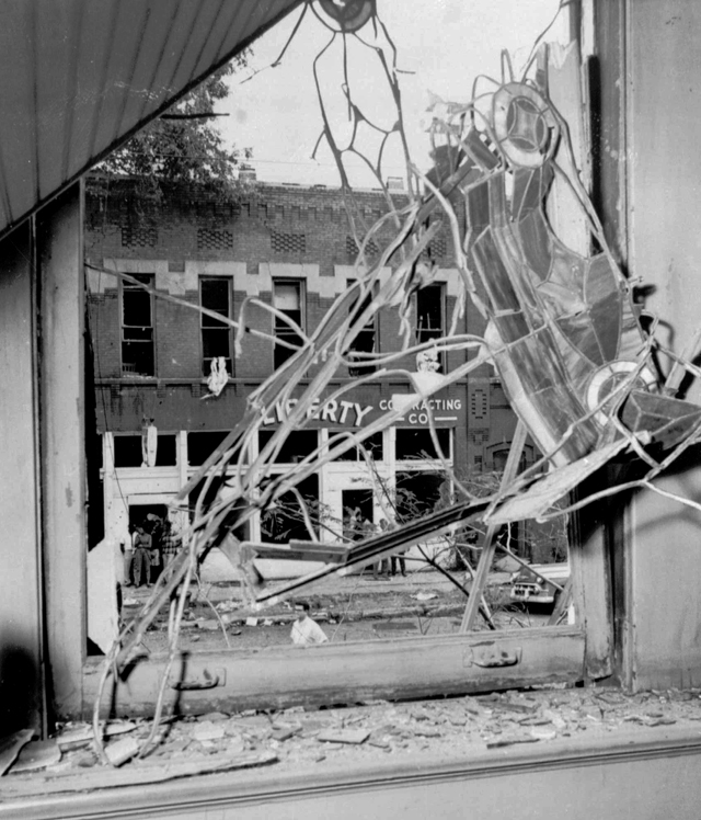 The blast sent a fireball into the air, blowing out a stained-glass window, sending shrapnel into the air and melting metal fixtures. (Image Credit: Birmingham News/AP Photo)