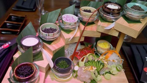 A high-end Japanese restaurant, Katsu, has just opened in the northern California town of Los Gatos. First thing on the menu is a dish called the Decadence Staircase, featuring Russian Sevruga, Osetra, Golden Osetra caviar and premium Beluga caviar, descending along bamboo stairs.