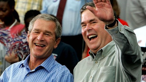 George W. Bush and his brother Jeb Bush smile while greeting supporters during a campaign rally at Progress Energy Park, Oct. 19, 2004 in St. Petersburg, Fla. (Mark Wilson / Getty Images)