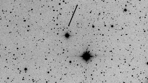 10:52 a.m. ET: The European Space Agency has posted an image of the asteroid about seven hours before closest approach to Earth. The picture is a negative, so it shows the stars as black dots on a white background. The asteroid, ESA says, is the straight-line streak running across the top center of the frame.