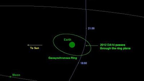 Asteroid 2012 DA14 will miss the Earth today, scientists assure us - but it won't miss by much. At 2:25 p.m. ET it is expected to pass 17,220 miles from us, flying from south to north in a path that brings it closer than the geosynchronous satellites we use for communications and many weather observations.