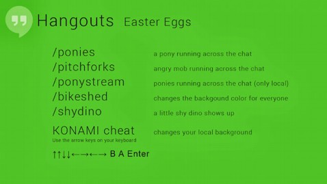 Maybe these bits of fun will make happy those users who are disappointed in the current lack of SMS, or text messaging, support in the new Hangouts service. Though another Google employee recently mentioned on her Google+ page that SMS was "coming soon" to Hangouts, she later made an edit to the same post, saying, "Oops! We actually have nothing to announce at this time. My apologies."