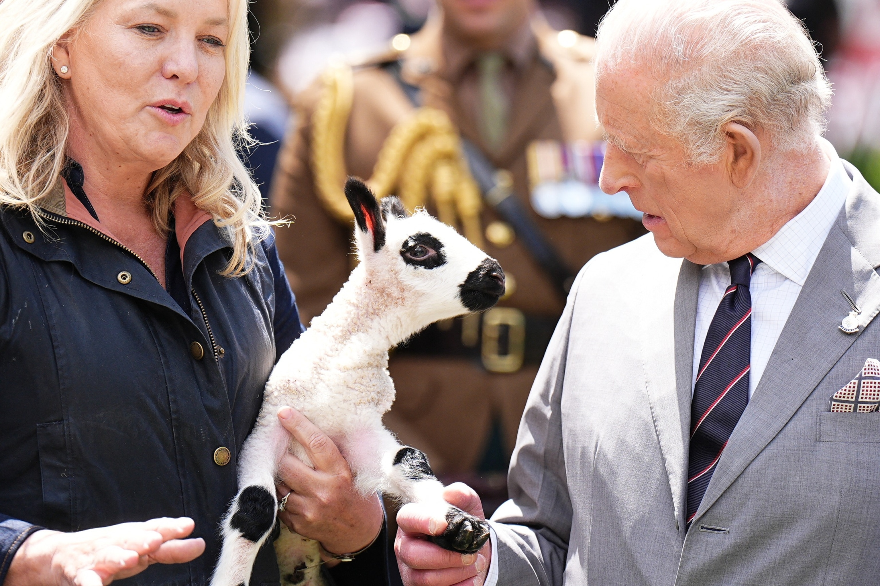 A Kerry Hill Welsh lamb, which was just born, is shown to King Charles III during a parade and block party in Front Royal, Virginia, April 30, 2026.