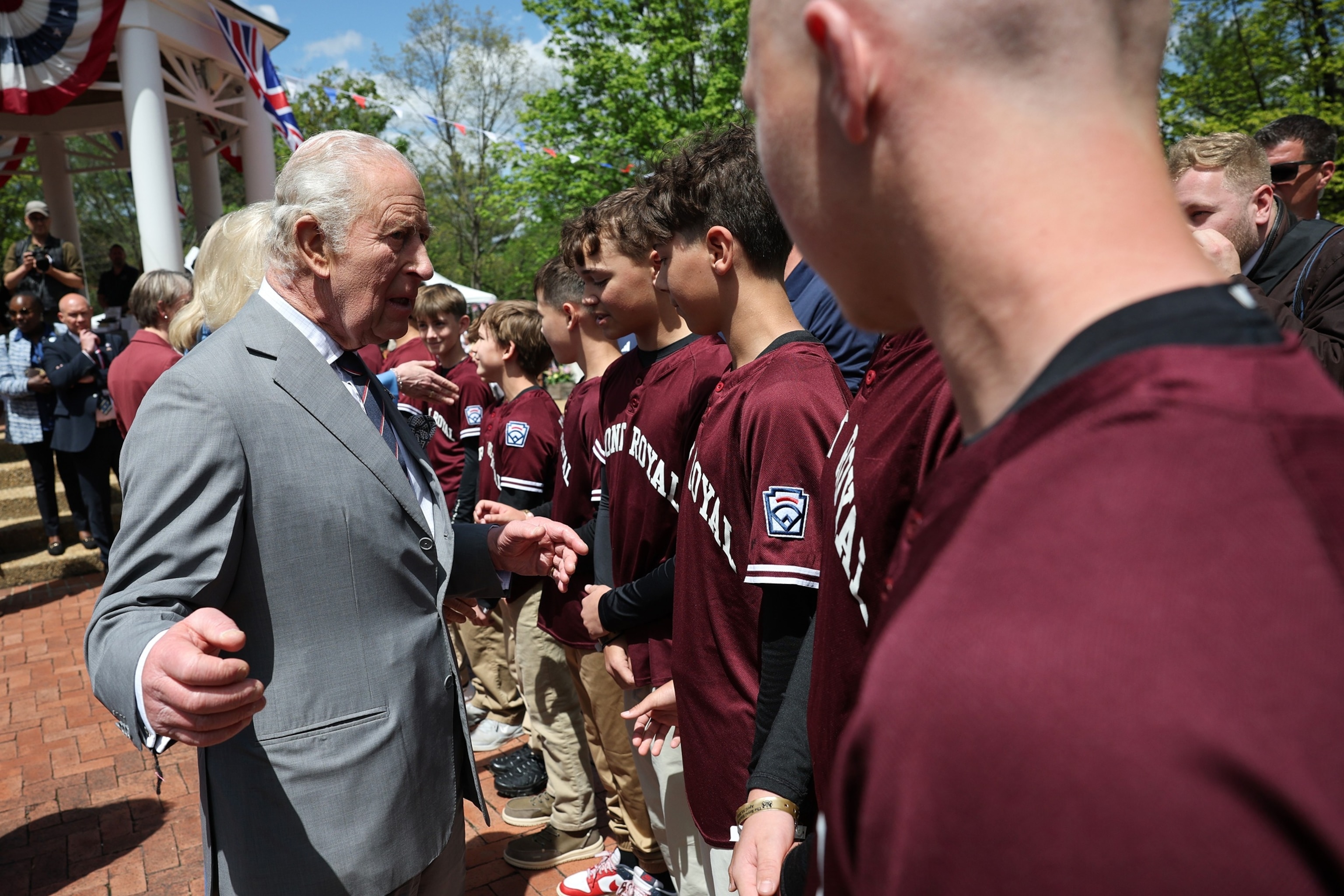 King Charles III and Queen Camilla greet the Virginia state champions Front Royal Little League baseball team during a parade and block party event, April 30, 2026 in Front Royal, Virginia.