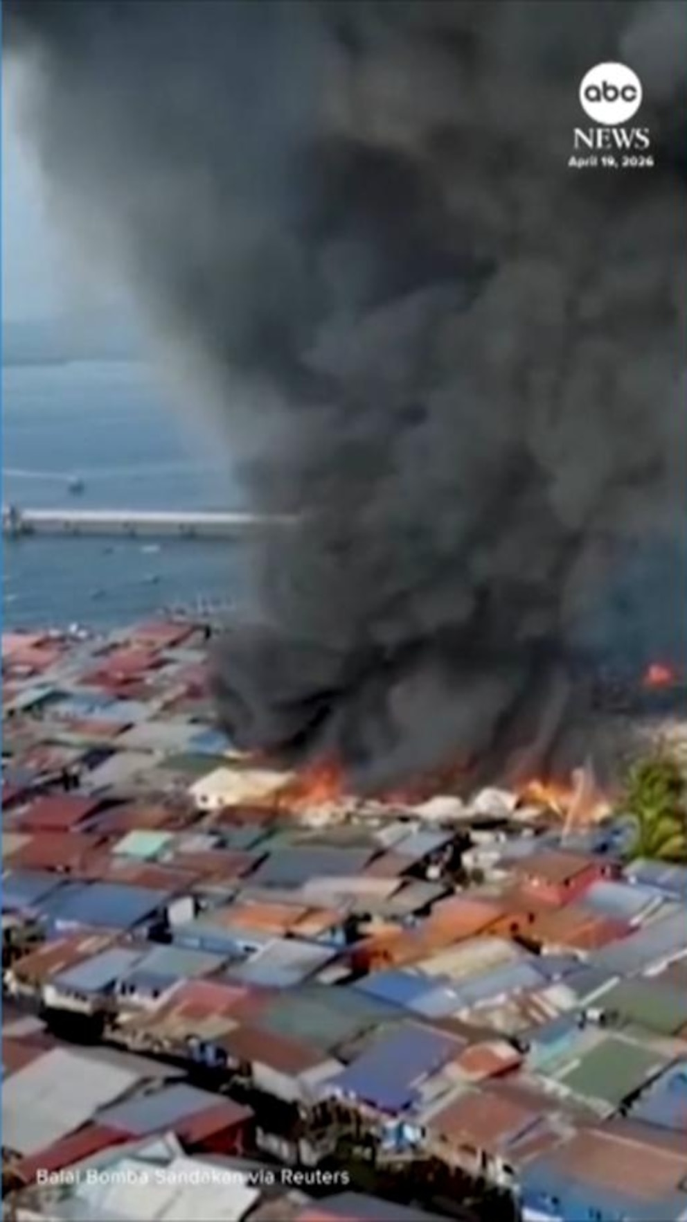 A fire that tore through a Malaysian coastal settlement on Borneo Island destroyed about 1,000 homes and displaced more than 9,000 people, authorities said.