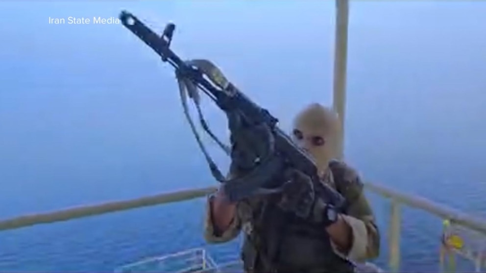 Iranian state TV airs video of masked gunmen boarding ship near Strait of Hormuz