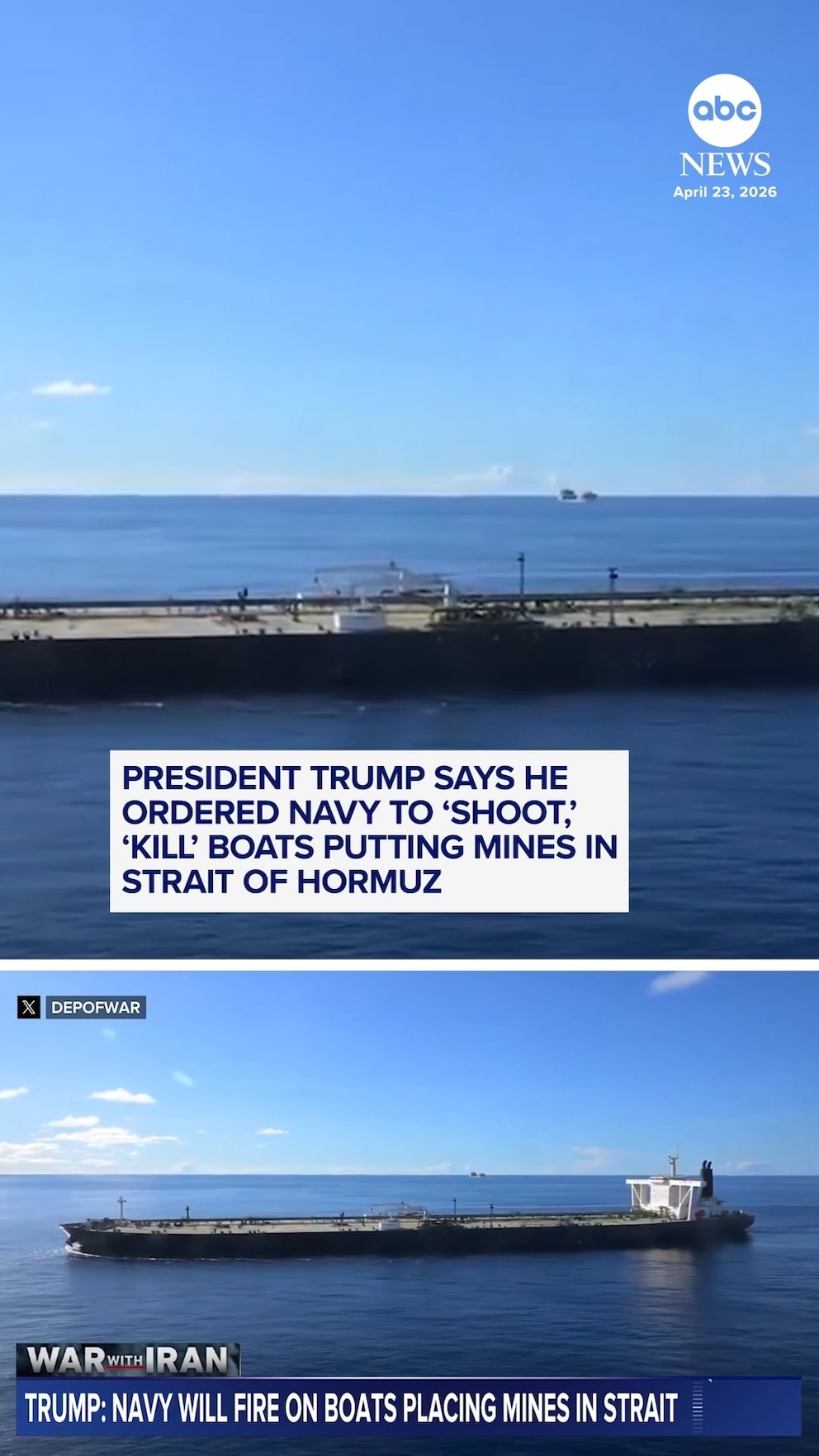 Apr 23, 2026Trump orders Navy to 'shoot and kill' any boat laying mines in Strait of Hormuz